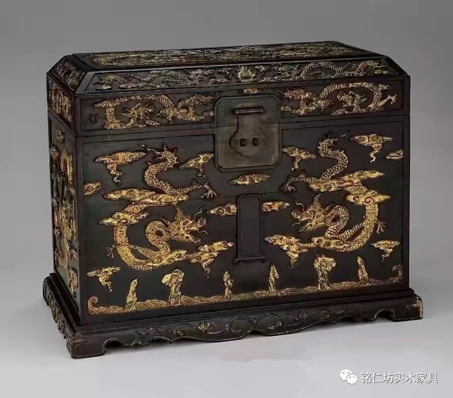 紫檀五爪金龍箱,長63厘米,寬33.5厘米,高47.6厘米。蓋與箱沿邊施闊皮條線,鏟地高浮雕雙龍戲珠紋,間布朵云紋,下部雕海水江崖紋。底座壺門式輪廊,上刻卷草紋。所有高浮雕紋飾上皆描金,在檀木的襯托下,更絕醒目、華麗。